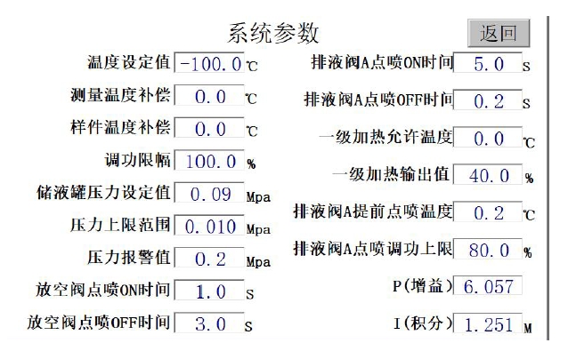 溫度設(shè)定值:設(shè)置低溫汽化器出口目標(biāo)溫度值;測量溫度補(bǔ)償:設(shè)置低溫汽化器出口溫度傳感器校正值:樣件溫度補(bǔ)償:設(shè)置樣件溫度傳感器校正值;調(diào)功限幅:設(shè)置低溫汽化器二級加熱大輸出功率;儲液罐壓力設(shè)定值:設(shè)置儲液罐內(nèi)目標(biāo)壓力值;壓力上限范圍值:設(shè)置儲液罐內(nèi)目標(biāo)壓力范圍值:壓力報警值:設(shè)置儲液罐內(nèi)目標(biāo)壓力上限報警值;放空閥點(diǎn)噴